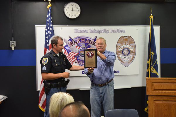 Gaska Tape owner Jack B. Smith presented a donation on Aug. 12 to the Elkhart Police Department’s Canine Unit to cover the costs of replacing the dogs. He received a plaque honoring him for his support from the department.