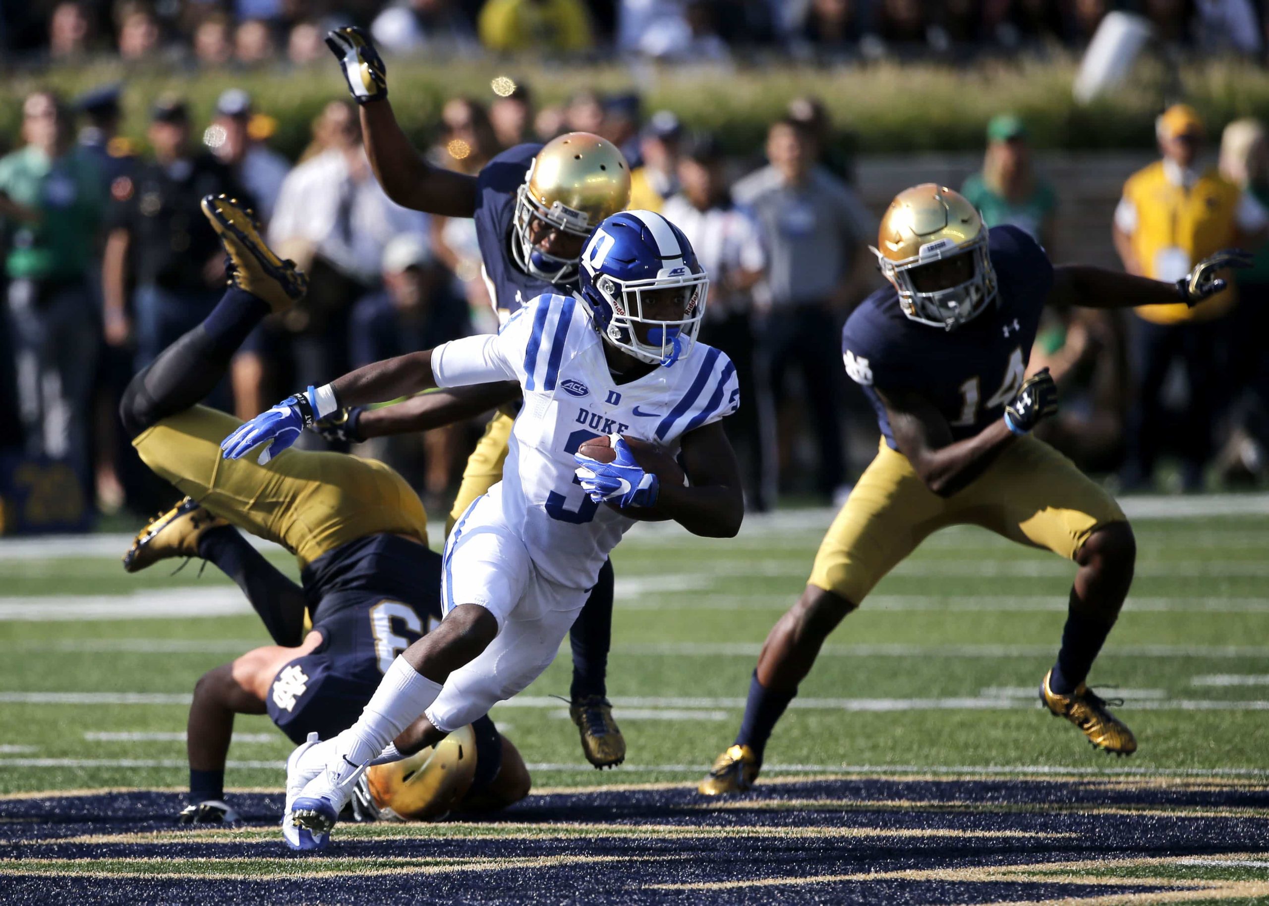The Blue Devils, who managed a total of 27 points in losses to Wake Forest and Duke, scored 28 in the first half against the Irish. Duke scored three straight touchdowns after falling behind 14-0.