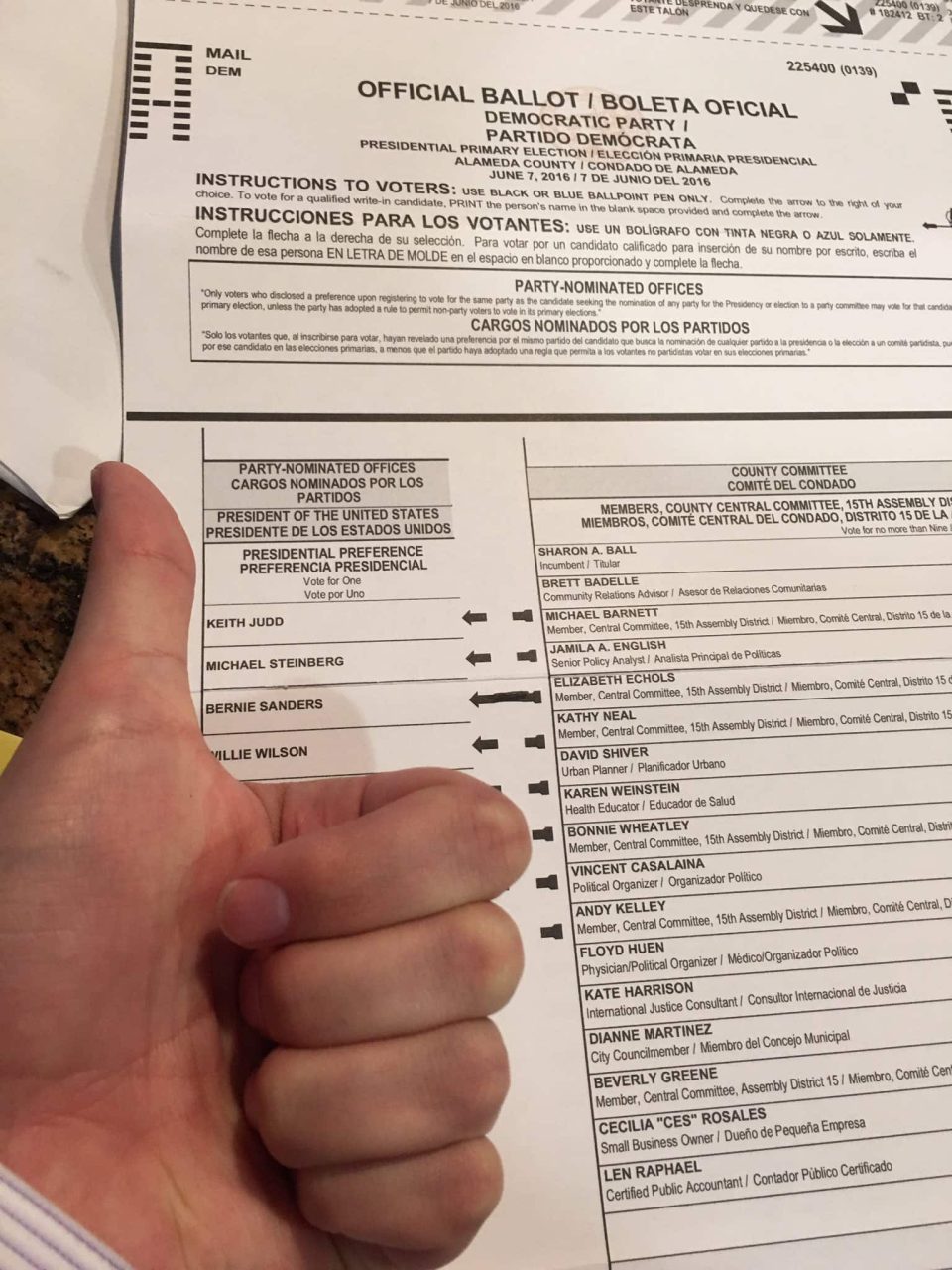 This June 7, 2016, photo provided by Taylor Huckaby, of California, shows Huckaby's election ballot. Ballot selfies, where people use smartphones to photograph and share their marked ballots online, are becoming more common, as voters young and old look to share their views with family, friends and the world. But what they don't realize is they may be breaking the law, depending on where they live. (Taylor Huckaby via AP)