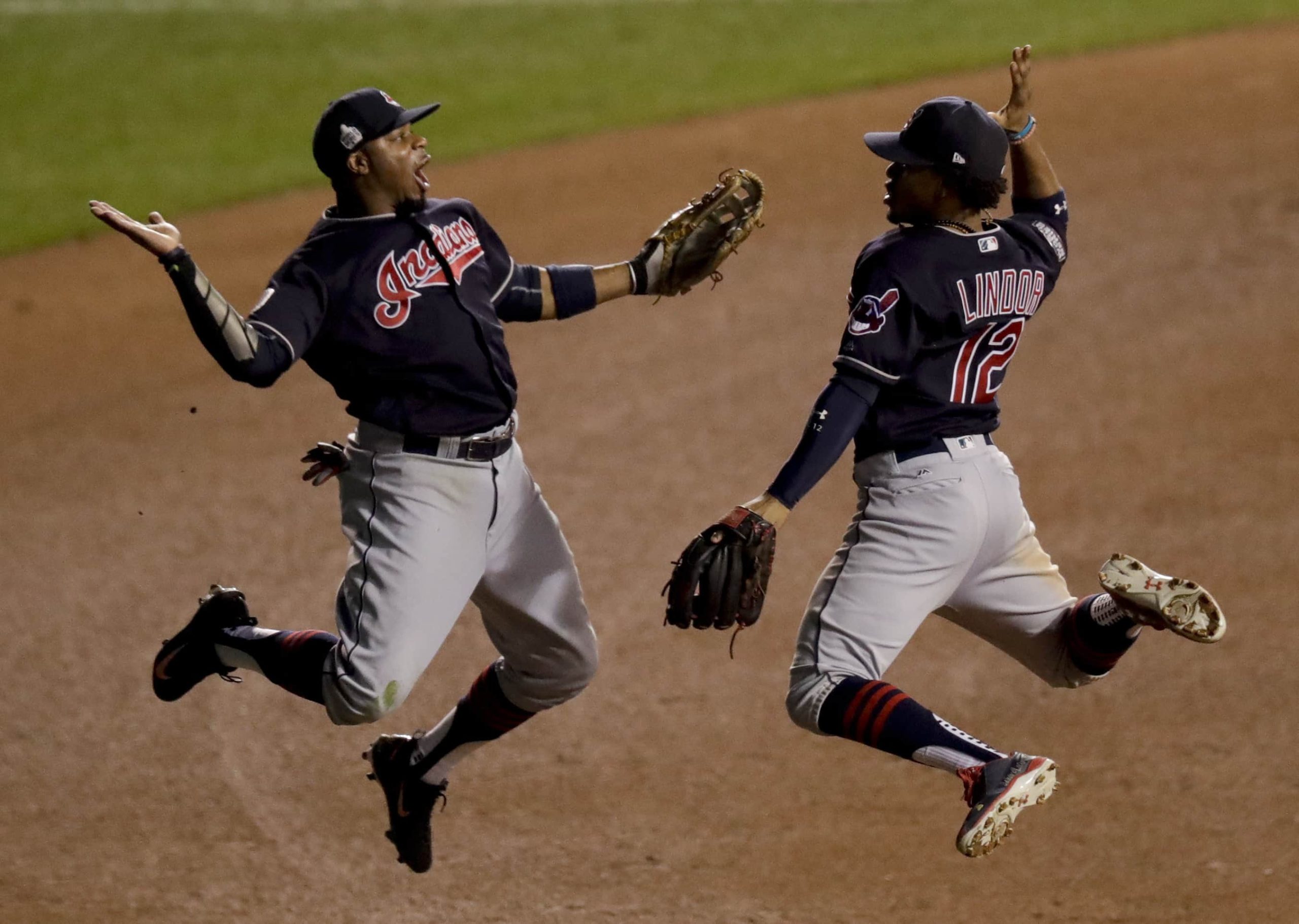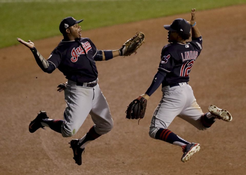 Cleveland Indians left fielder Rajai Davis, left, and shortstop Francisco Lindor celebrate their win after Game 4 of the Major League Baseball World Series against the Chicago Cubs Saturday, Oct. 29, 2016, in Chicago. The Indians won 7-2 to take a 3-1 lead in the series. (AP Photo/Charles Rex Arbogast)