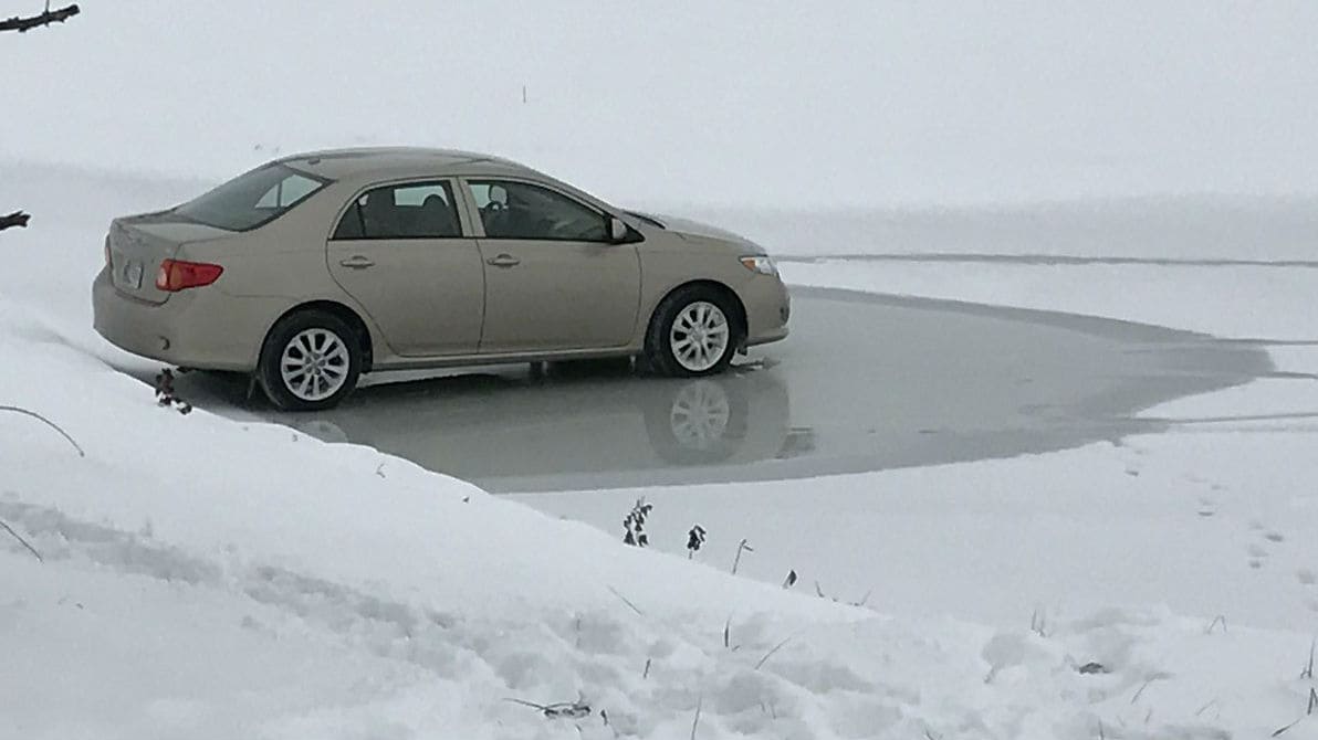 The uninjured driver was able to get out of the car and walk back up the hill away from the pond. The car never crashed through and was removed by a tow truck with no damage done.
