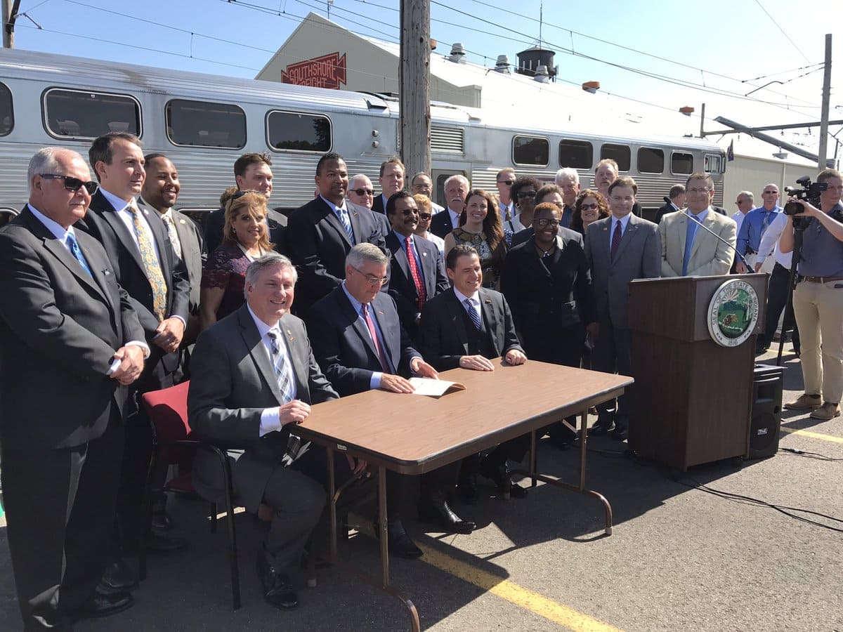 Governor Eric Holcomb took a ride on the South Shore Line Thursday morning, on his way to officially sign legislation that will double track the line.