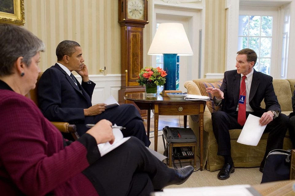 Former TSA Administrator John Pistole (right) meets with former Homeland Secretary Janet Napolitano and former President Barack Obama (By The White House from Washington, DC - P101210PS-0525, Public Domain, Link)