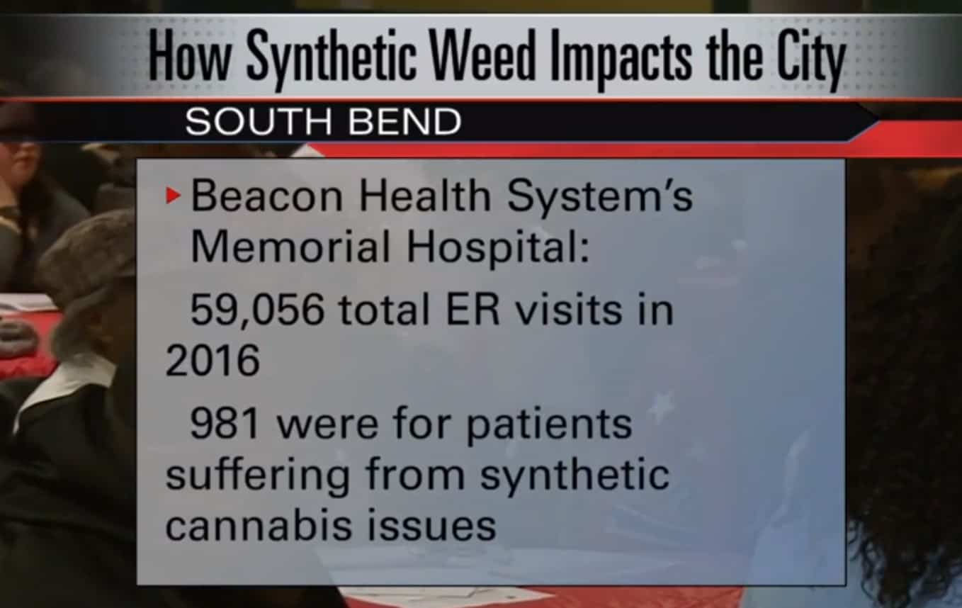 Statistics provided by Beacon Health System about the drug revealed that there were nearly 60,000 ER visits at Memorial Hospital in 2016, and about 1,000 of them were due to complications from synthetic marijuana. ABC 57 reports that, last year, that number went up to 1,300.