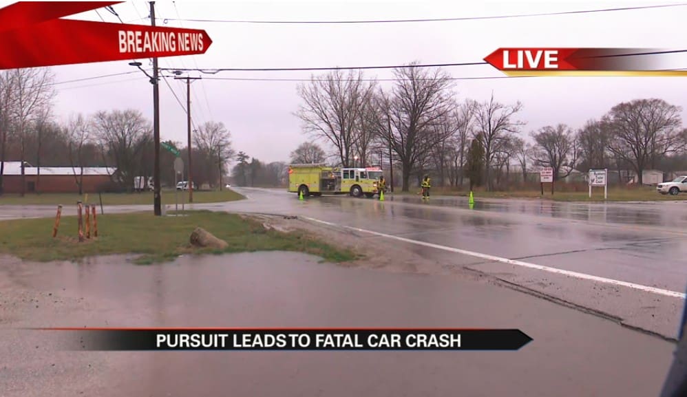 The pursuit continued eastbound on I-94 where the vehicle exited at M-139 and turned southbound toward Scottsdale. The vehicle continued southbound on M-139 where it lost control north of Rockey Weed Road and crashed into a large tree.