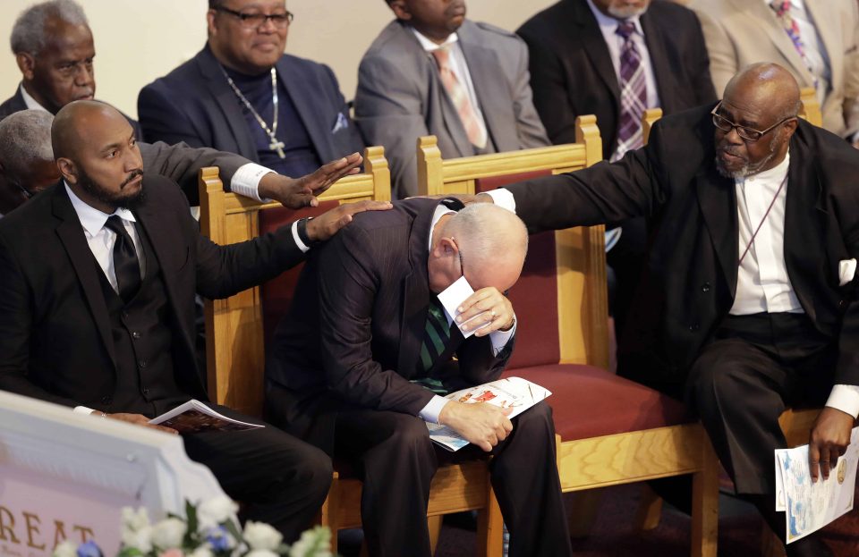 Marion County Prosecutor Terry Curry is comforted after speaking during the funeral of Glenn Coleman, Reece Coleman, Evan Coleman and Arya Coleman, Friday, July 27, 2018, in Indianapolis. Nine members of the Coleman family were killed after a duck boat capsized and sank during a storm in Branson, Mo. (AP Photo/Darron Cummings)