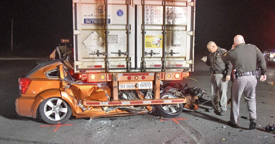 The Peterbilt semi was traveling from northbound 350 West onto Westbound US 30 and was slowing or stopping in the median, witnesses told police. The trailer was then struck by an eastbound Dodge passenger vehicle.
