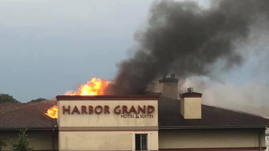 Images broadcast by 95.3 MNC’s reporting partners at ABC 57 show the blaze show the fire coming from the roof of the Harbor Grand Hotel.
