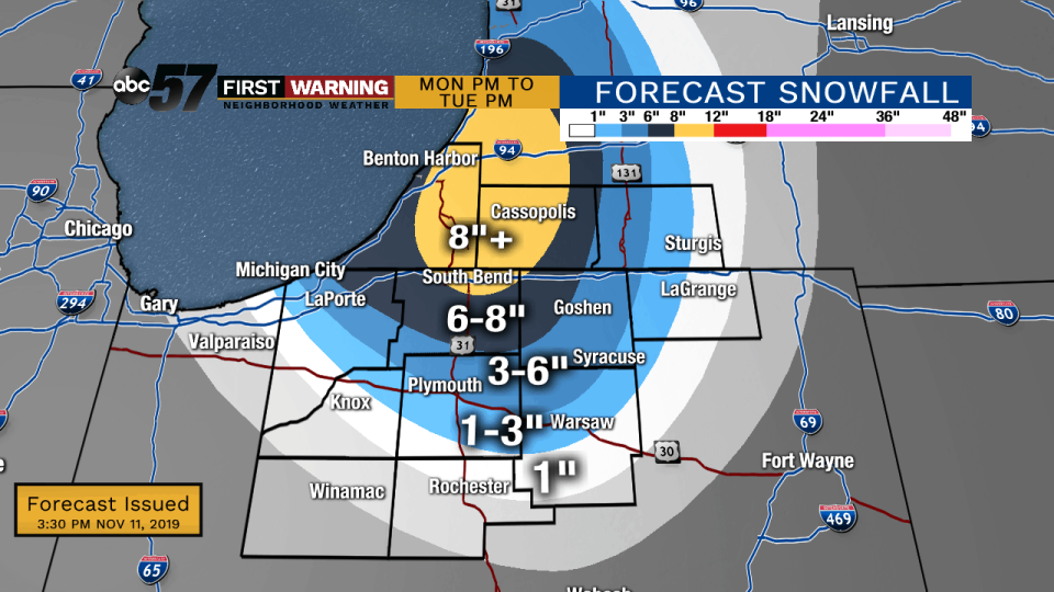 (Tom Coomes/ABC 57) Lake effect snow will persist on Tuesday, Nov. 12, with intense snow bands, with snowfall rates of more than two inches per hour. Areas under the bands for the longest period of time could see in excess of a foot of snow through Tuesday evening.