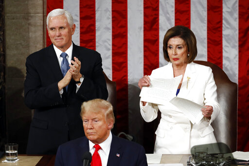 House Speaker Nancy Pelosi of Calif., tears her copy of President Donald Trump's s State of the Union address after he delivered it to a joint session of Congress on Capitol Hill in Washington, Tuesday, Feb. 4, 2020. Vice President Mike Pence is at left. (AP Photo/Patrick Semansky)