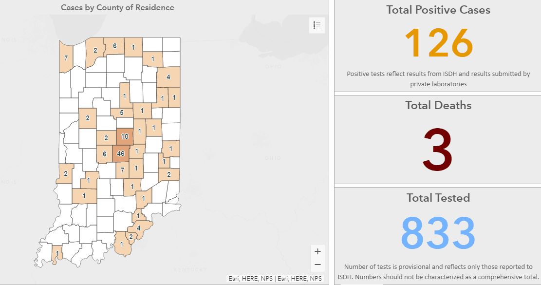 On the statewide level, The Indiana State Department of Health reported 47 new positive cases of COVID-19, on Saturday, March 21, bringing to 126 the number of Hoosiers diagnosed through ISDH, the Centers for Disease Control and Prevention and private laboratories. Three Hoosiers have died.