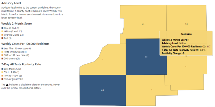 Kosciusko County has been under the blue advisory over the past four weeks.
