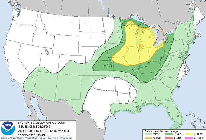 Much of the state will be under a “slight risk” of severe weather Tuesday. A slight risk implies that well-organized severe thunderstorms are expected but in relatively small numbers/coverage, or there is a small chance of a more significant severe event.