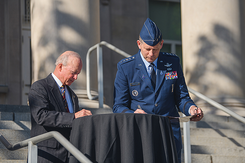Purdue President Mitch Daniels and Gen. David D. “DT” Thompson, USSF vice chief of space operations, signed a memorandum of agreement on the Purdue campus.
