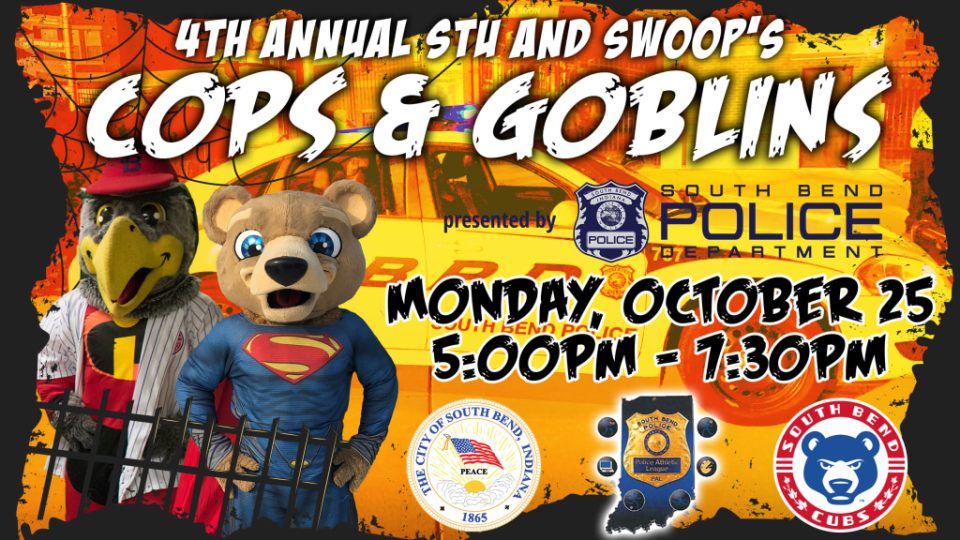 For the fourth year in a row, the South Bend Cubs will partner with the South Bend Police Department for Stu and Swoop’s Cops and Goblins trick or treating event on Monday, Oct. 25 at Four Winds Field. Gates will open at 5:00 p.m. and trick or treating will run until 7:30 p.m.