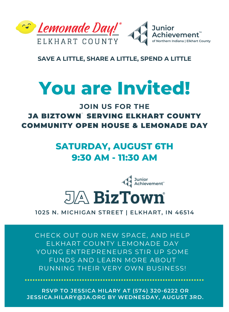 Junior Achievement serving Elkhart County is proud to announce JA BizTown will host a Community Open House on Saturday, August 6th from 9:30 am to 11:30 am in conjunction with the 2022 Lemonade Day festivities.