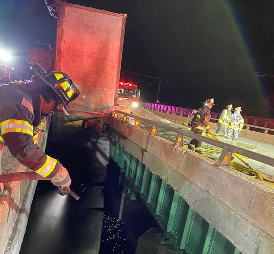 The vehicle struck the center median wall where it went over the wall, falling off the bridge and landing in the Calumet River. The trailer remained perpendicular, hanging off the bridge in between the east and westbound lanes. As a result of the crash, the truck/trailer caught on fire.