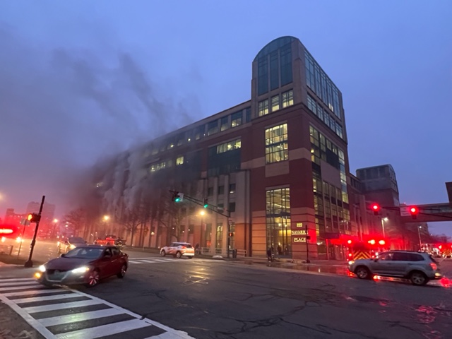 According to video taken from the scene, smoke was pouring out of the 2nd or 3rd floor. The office space above the floors was evacuated out of caution.