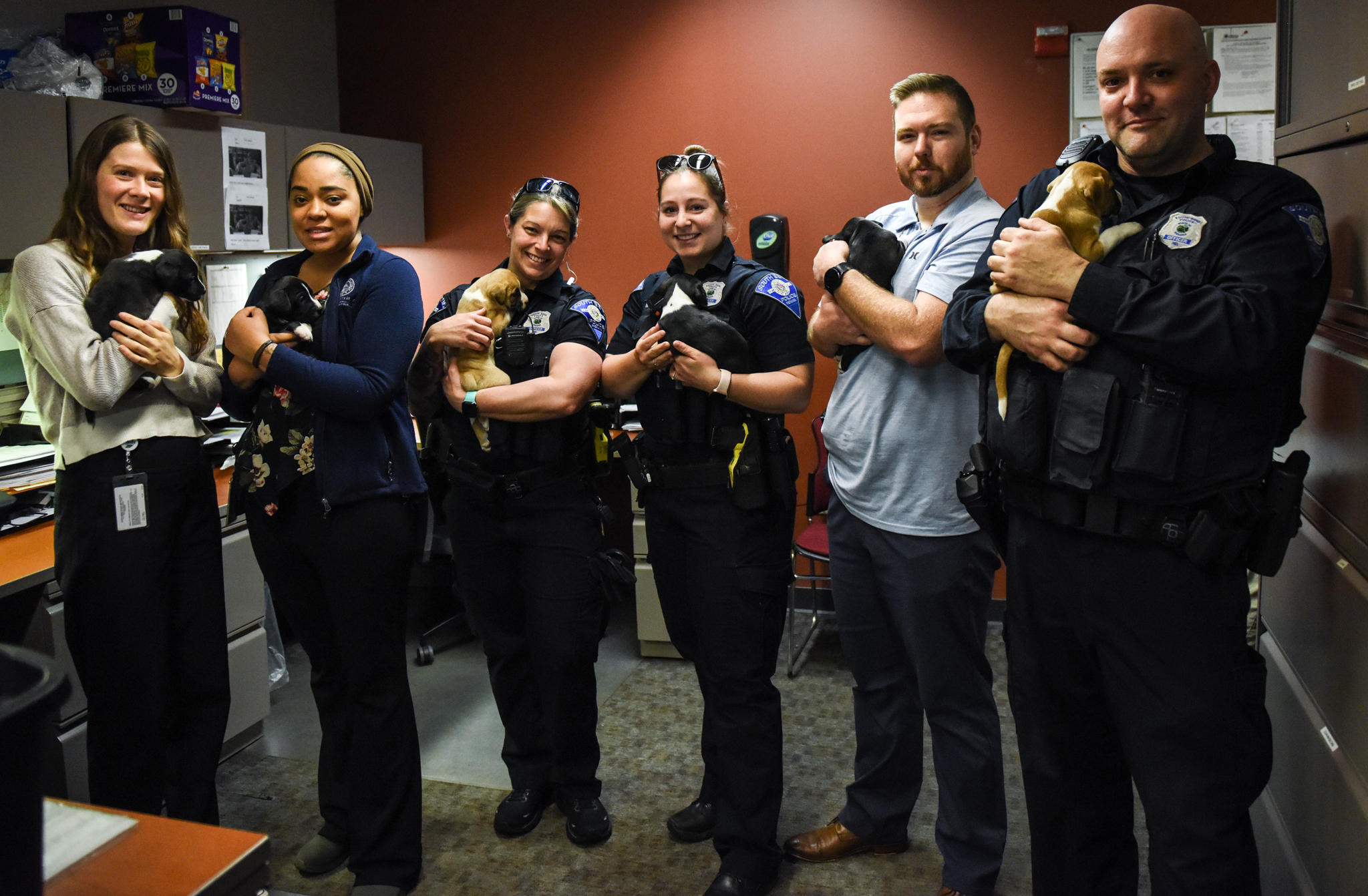 A concerned citizen found a tote full of puppies along the road in South Bend on Monday morning, April 22, and brought them to the South Bend Police Department for help. This, as the South Bend Animal Resource Center is dealing with a parvo quarantine. Former officer and current Crime Lab Technician Ron Kaszas volunteered to foster all six puppies until the quarantine is lifted.