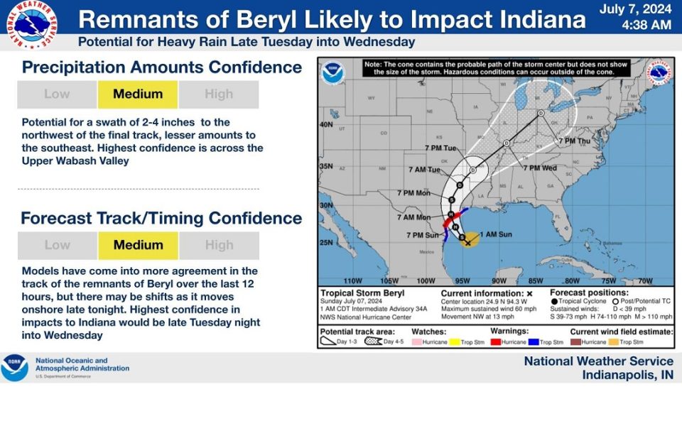 The National Weather Service Indianapolis says that Beryl’s path could still be altered, but at this point they are anticipating several inches of rain late Tuesday night and most of Wednesday. The Upper Wabash Valley will receive the most rain, with Lafayette seeming like the biggest target for central Indiana.