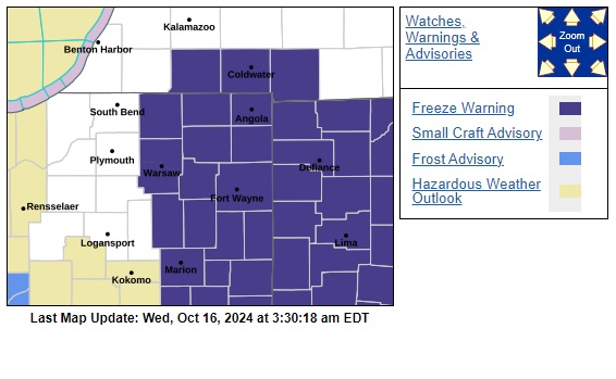 Most of Indiana is under either a freeze warning or a frost advisory until 9 am Wednesday.