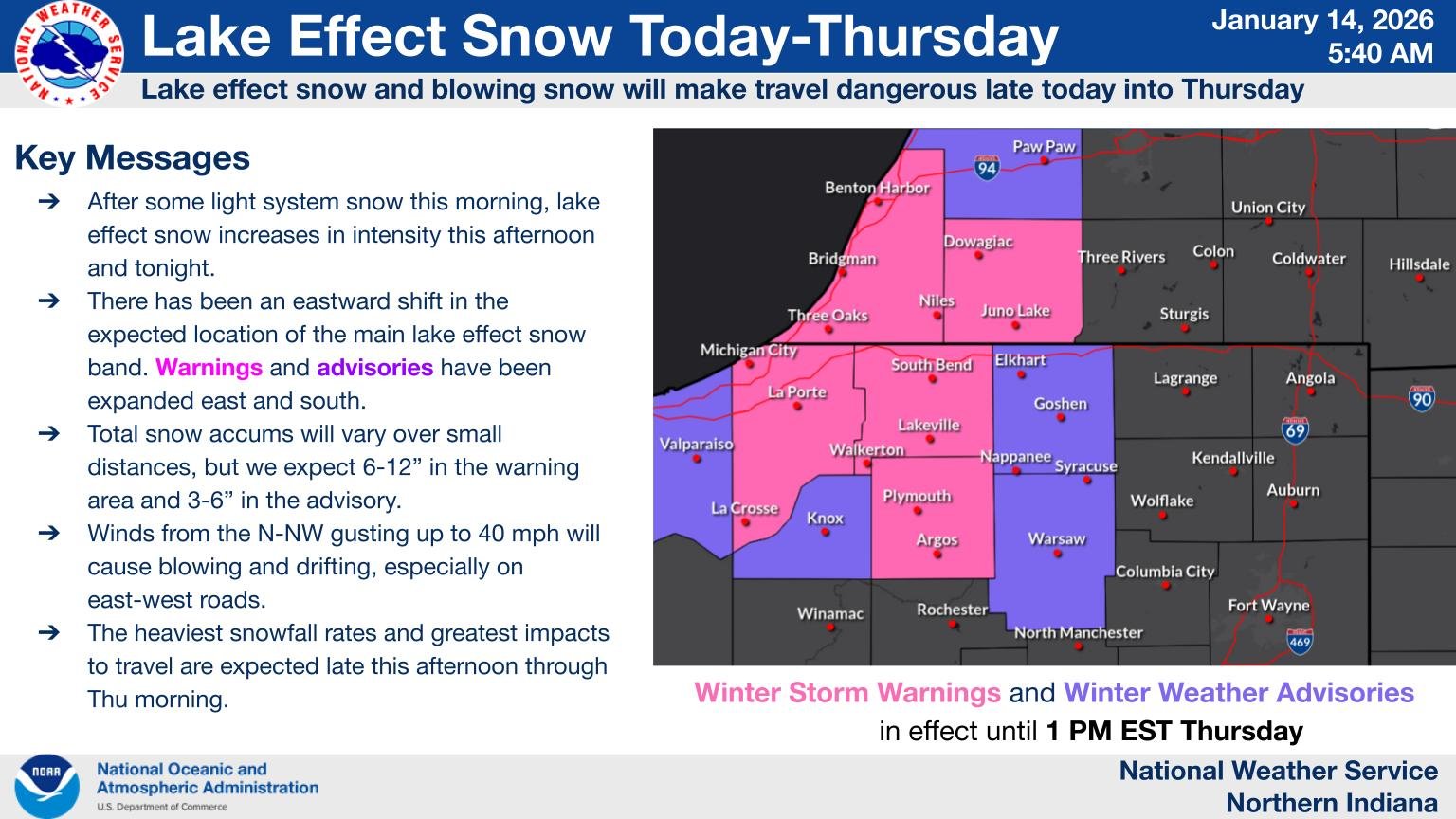 The National Weather Service has issued a Winter Storm Warning from Wednesday morning through Thursday afternoon for St. Joseph, LaPorte, Marshall, Berrien and Cass Counties. Total accumulations of 4 to 9 inches are possible under the warning area. A Winter Weather Advisory is in effect for Elkhart, Kosciusko, and Starke Counties.