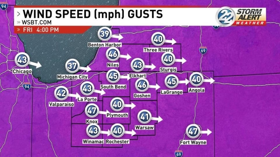 (WSBT Storm Alert Team) A High Wind Watch is in effect from 5 a.m. – 8 p.m. on Friday, March 13
