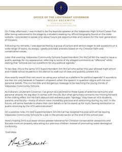 Later that evening, Jim McCall, superintendent of Valparaiso Community Schools, issued a public apology regarding Beckwith’s appearance, describing some of the alleged comments as “offensive” and emphasizing that schools should not serve as platforms for political agendas.